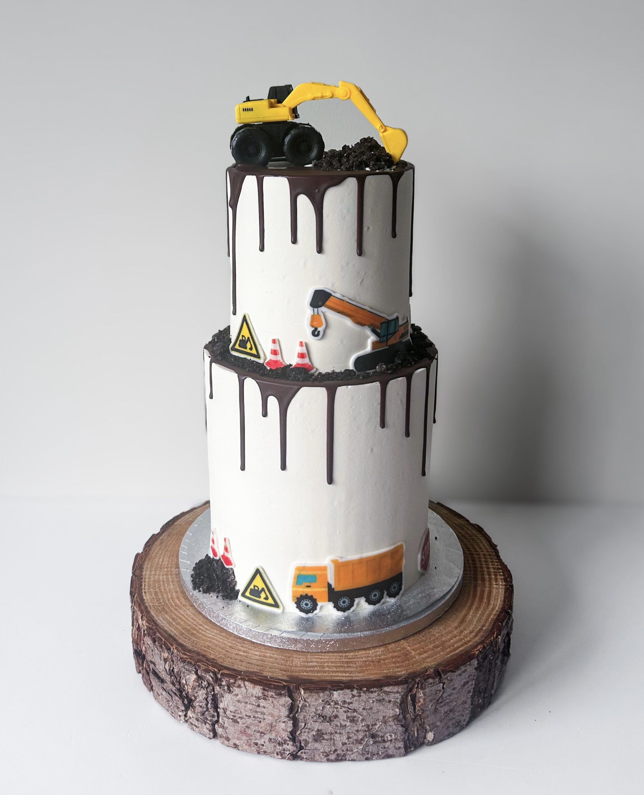 Op zoek naar een stoere kindertaart die helemaal in het thema van bouwen en graafmachines past? Deze graafmachinetaart met drip is dé blikvanger op elk kinderfeestje! Met een spectaculaire drip, eetbaar zand, verkeersbordjes en een felgekleurde speelgoed graafmachine bovenop is deze taart een feestje op zich.