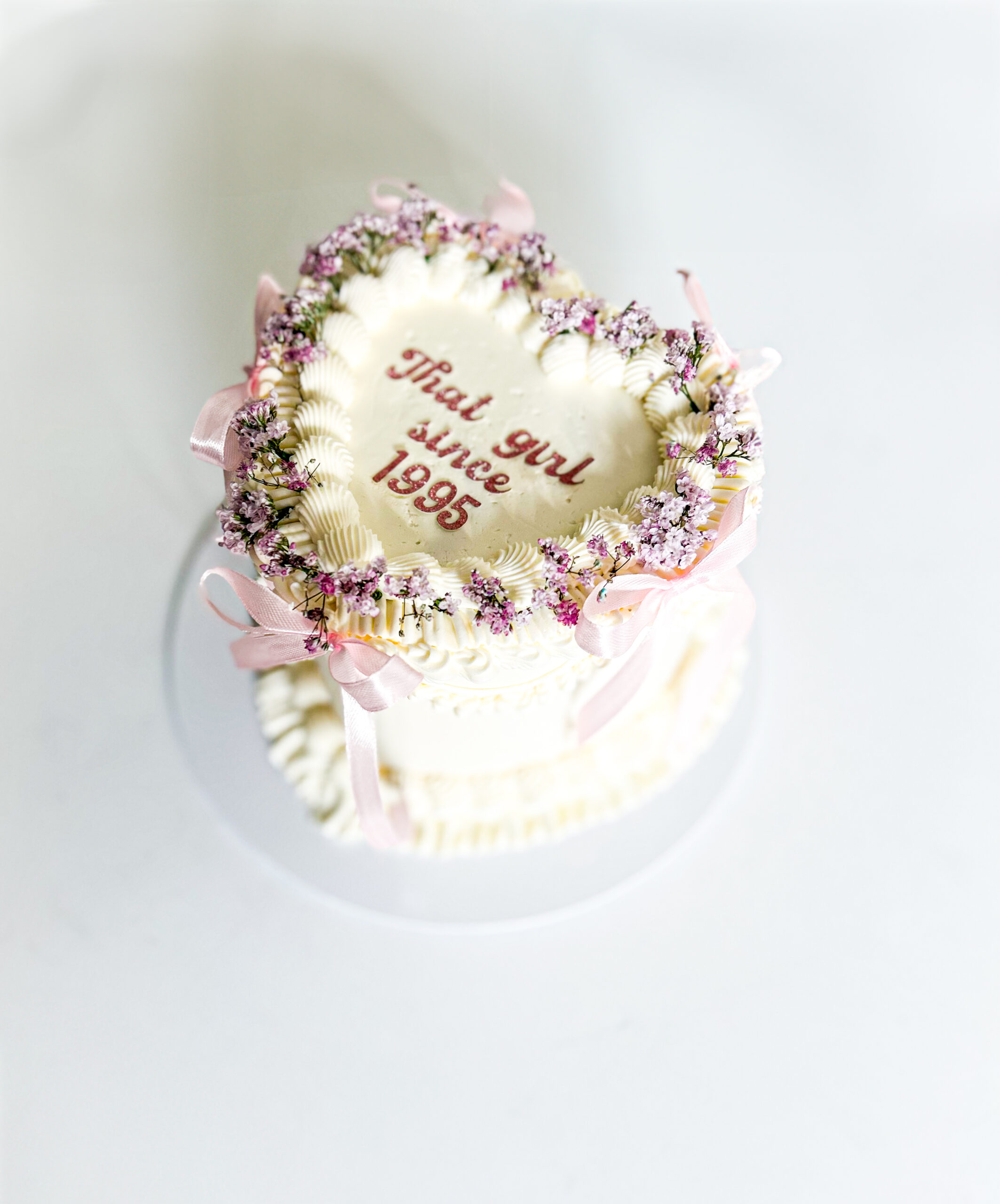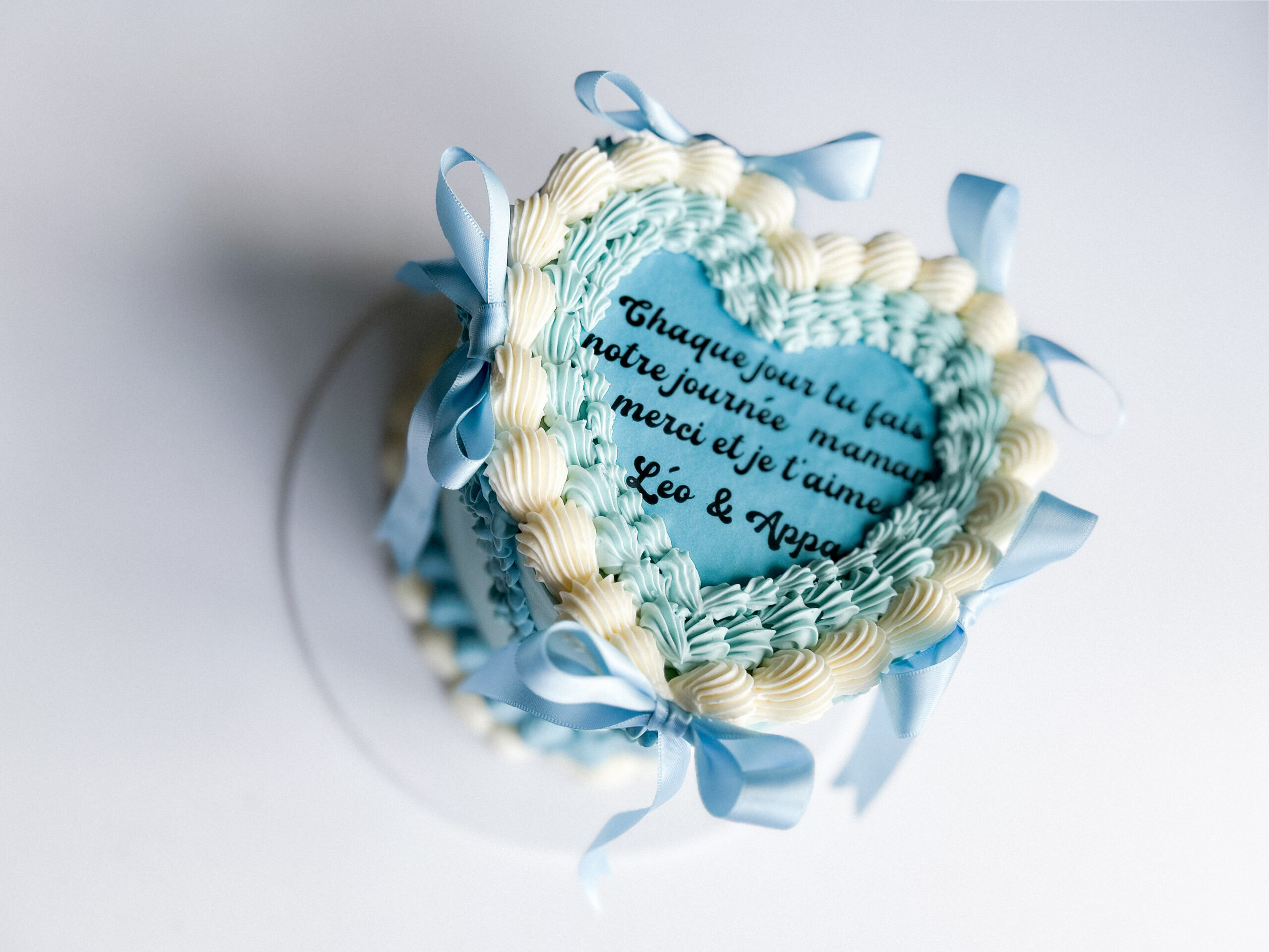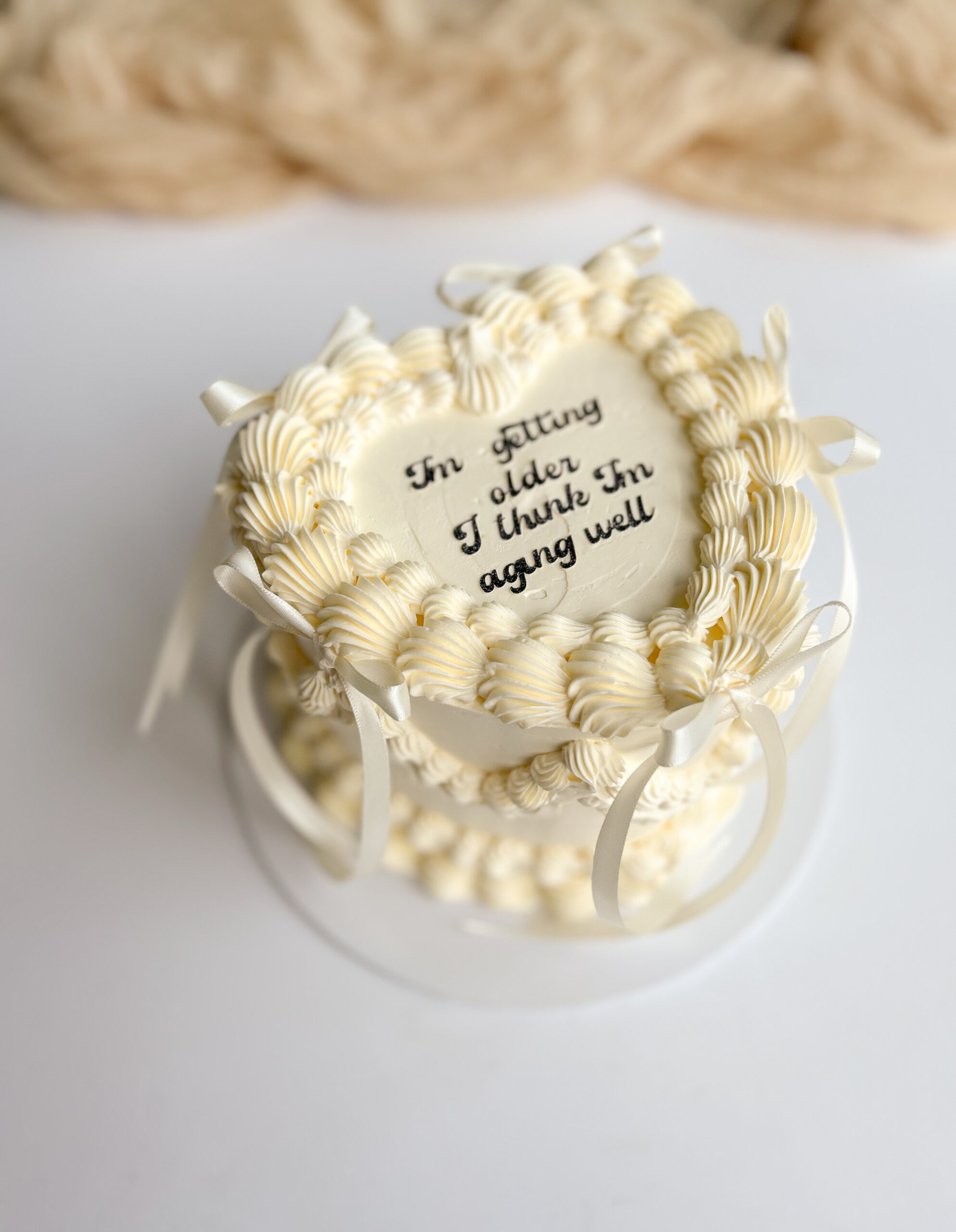 Laat iemand zich écht speciaal voelen met deze hartvormige taart in vintage stijl. Gedecoreerd met luxe spuitwerk van romige vanillebotercrème, sierlijke strikjes en een persoonlijke boodschap, is deze taart perfect voor een verjaardag, jubileum of gewoon om iemand in het zonnetje te zetten.