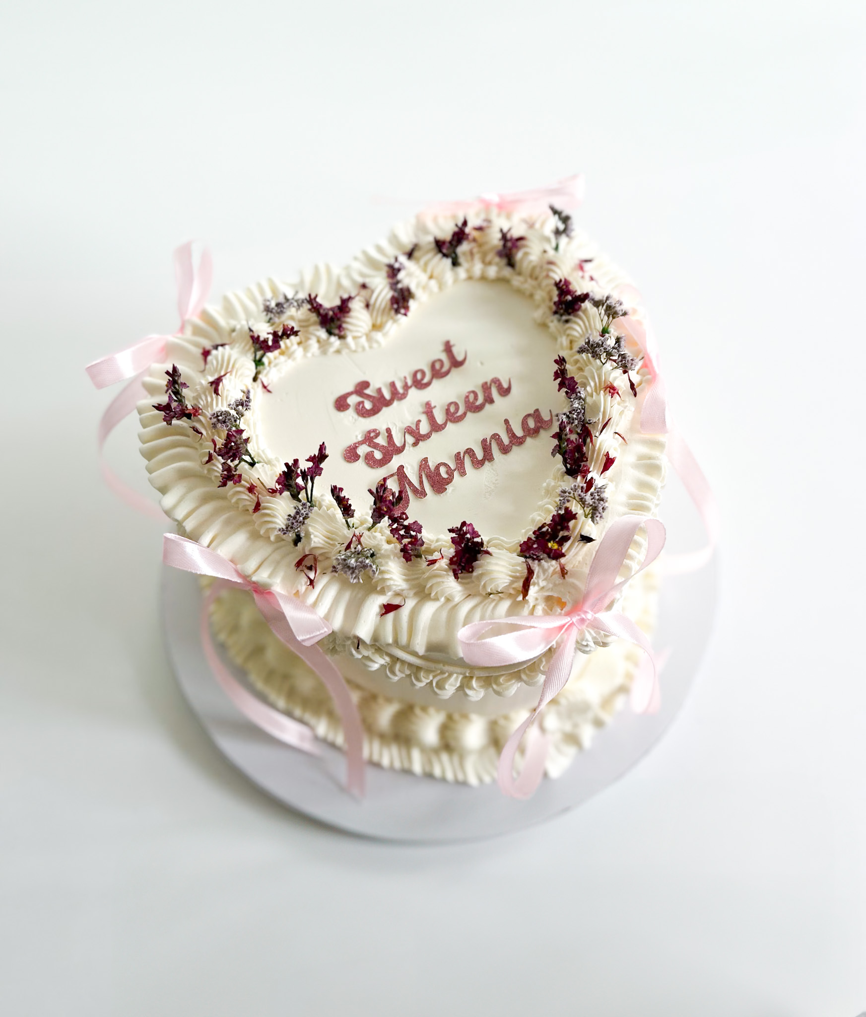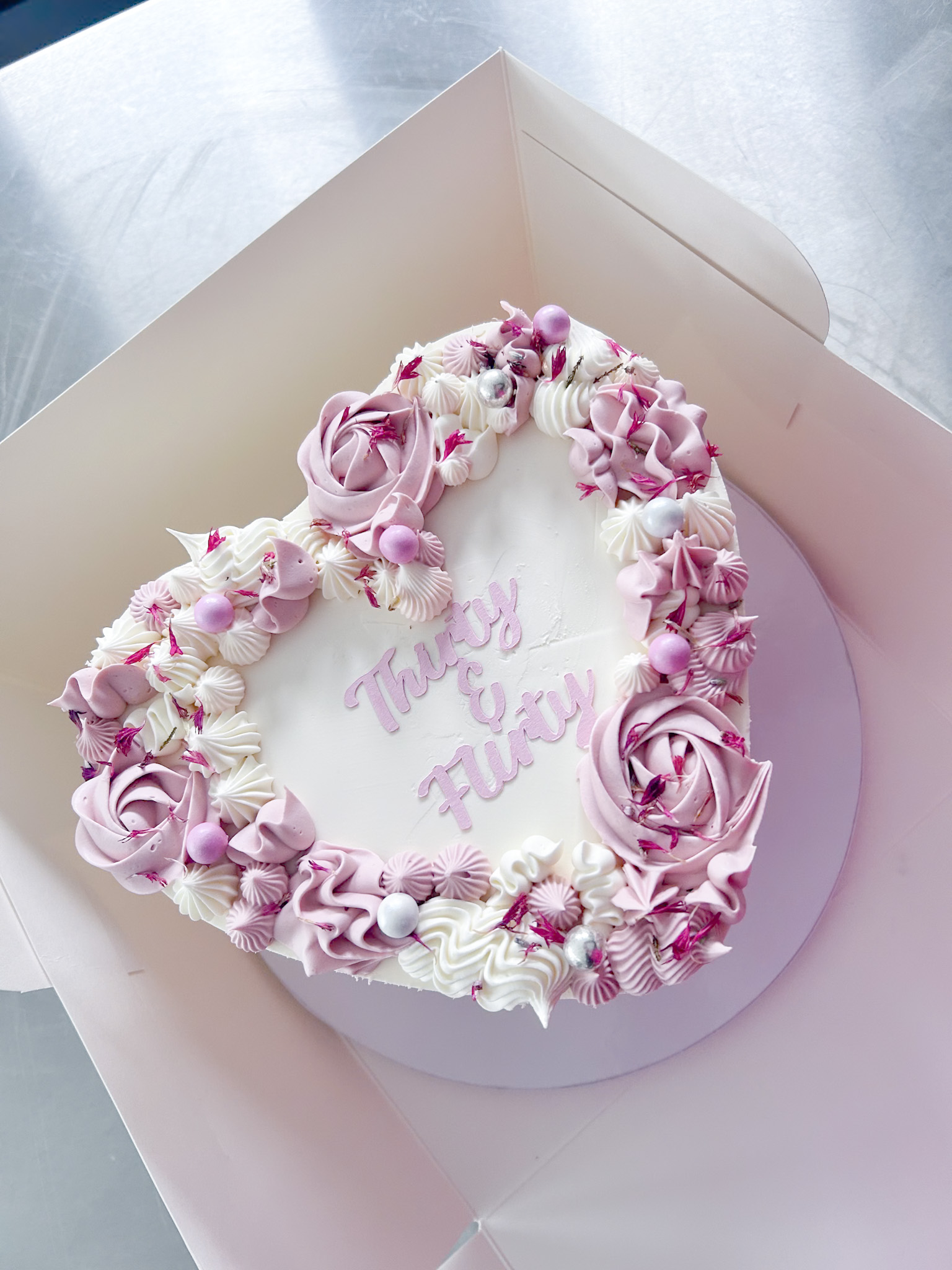 Hartvormige, volledig gepersonaliseerde taart met luchtige biscuit en romige botercrème.