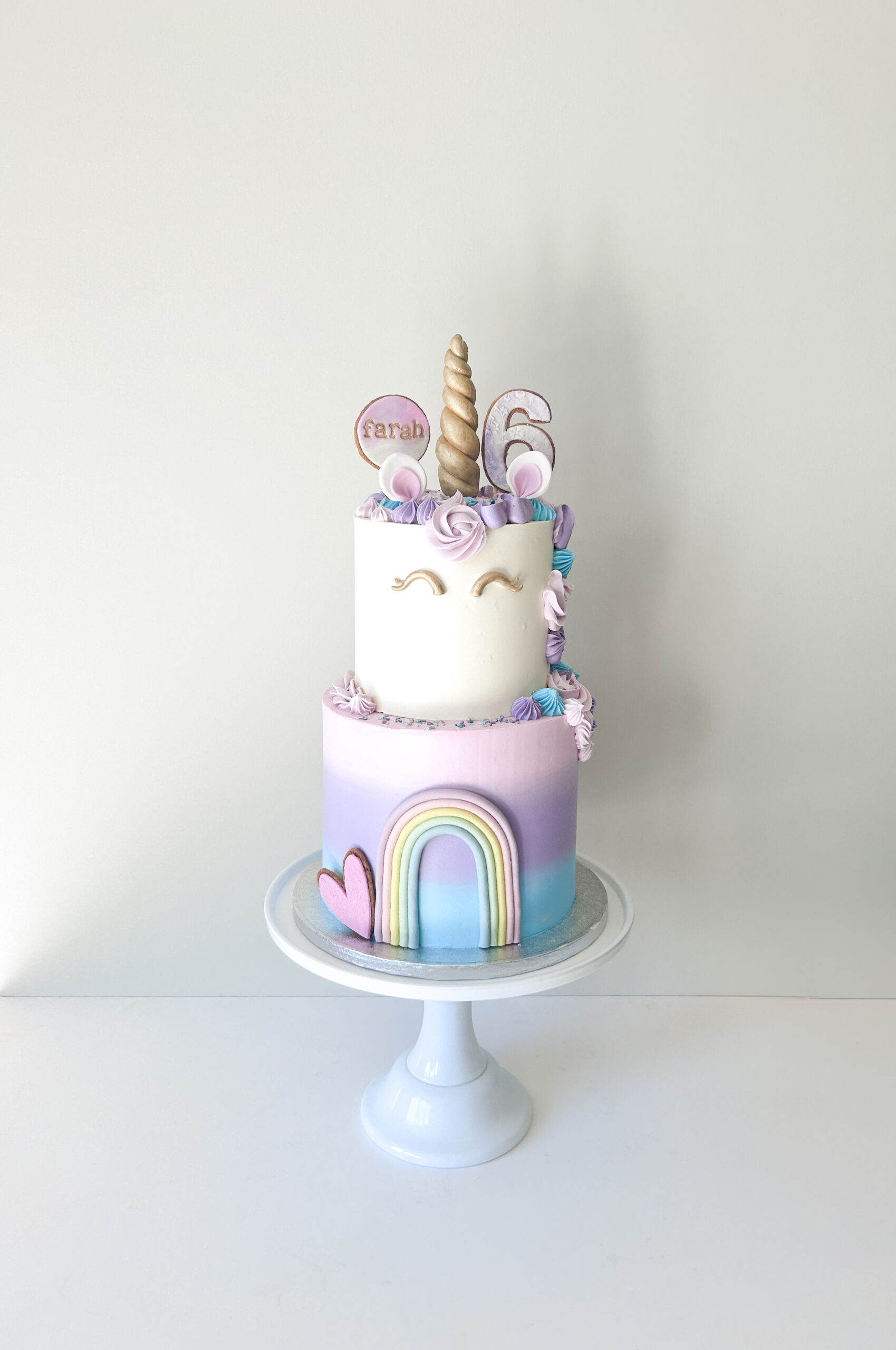 Elke laag van deze indrukwekkende taart bestaat uit kleurrijke botercreme, afgewisseld met romige vullingen aan de binnenkant die smelten op je tong. De buitenkant is stijlvol gedecoreerd met pastelkleuren, handgemaakte eenhoorn-oortjes, een gouden hoorn en speelse details zoals suikerdecoraties, sterren en regenboogjes. Een feestje om naar te kijken én om op te eten!